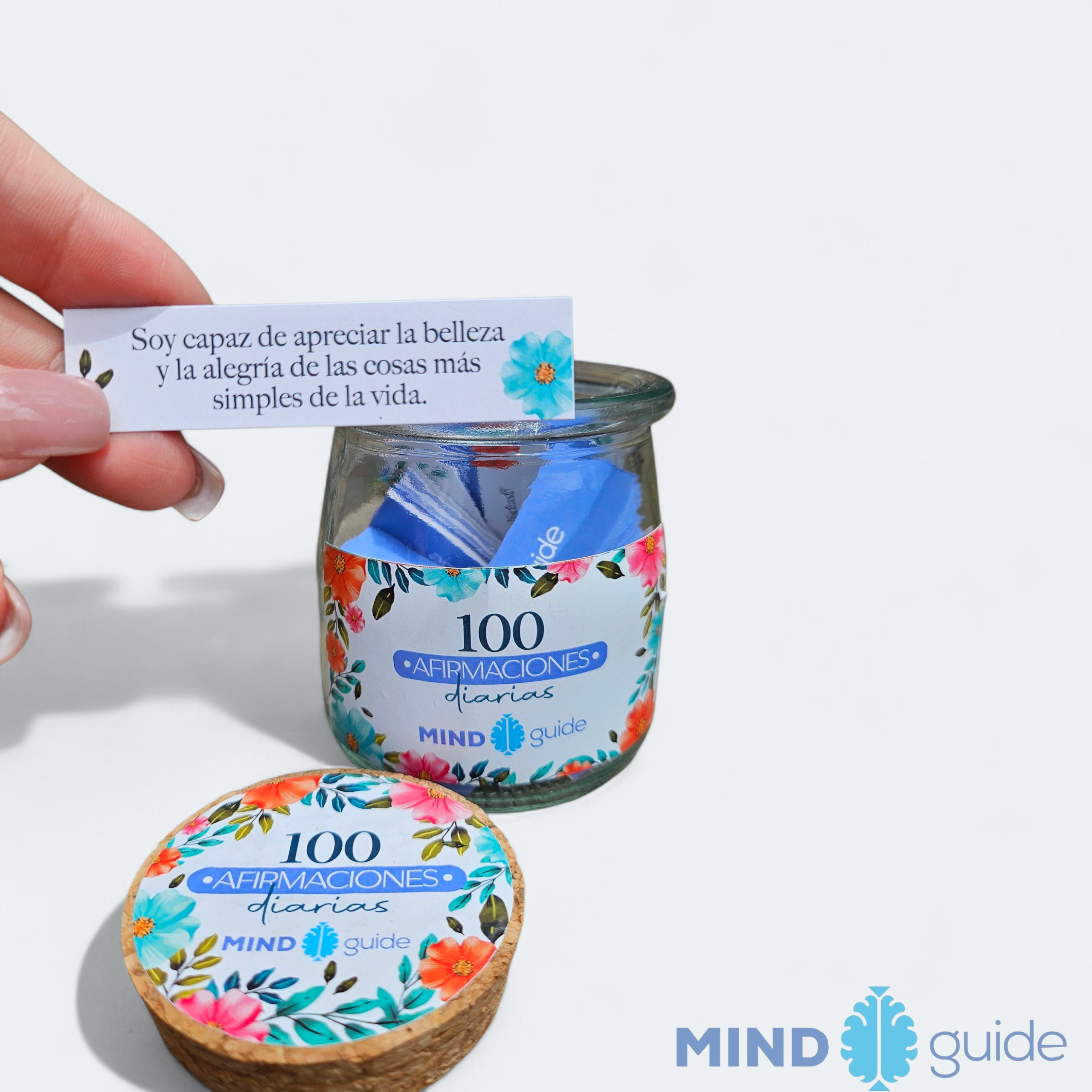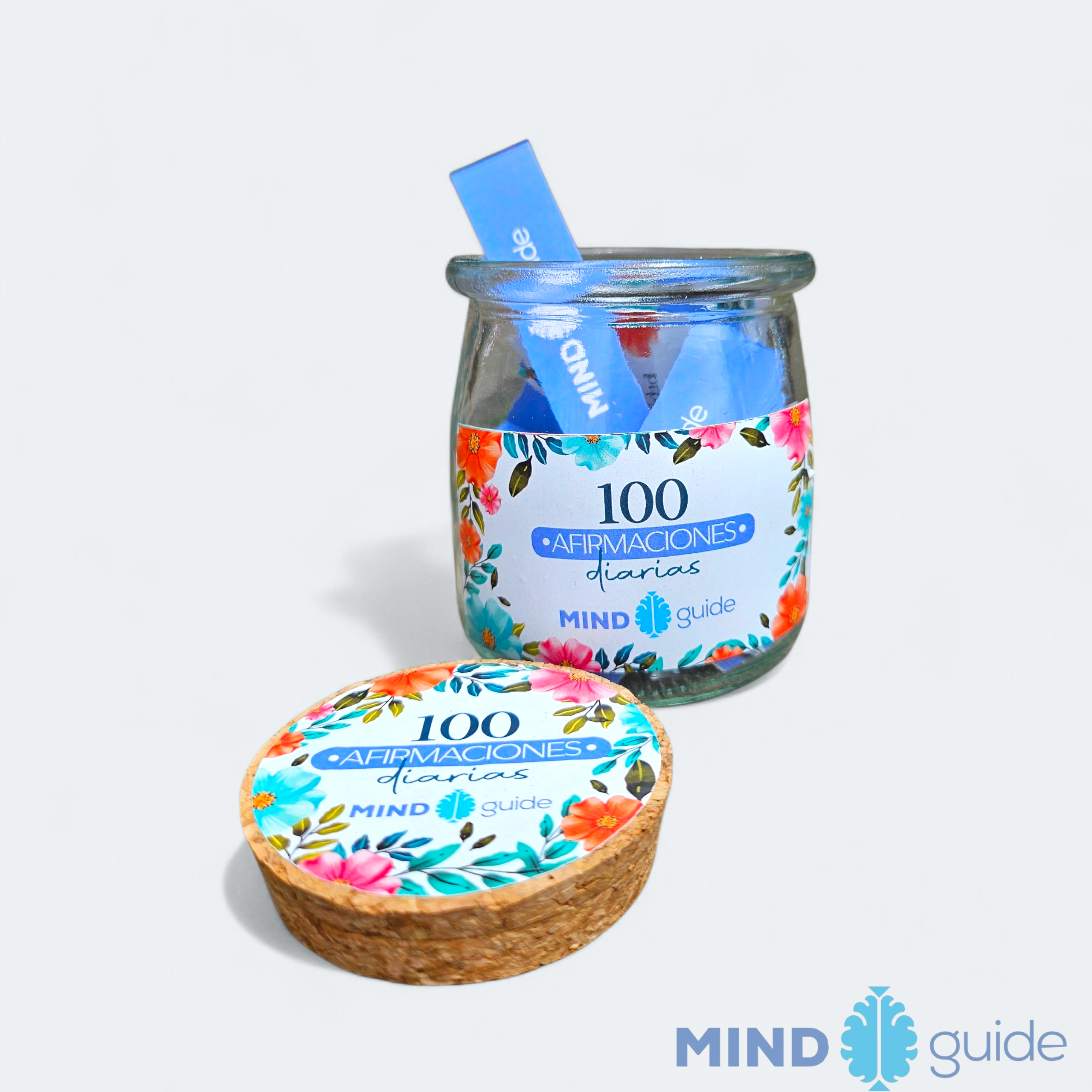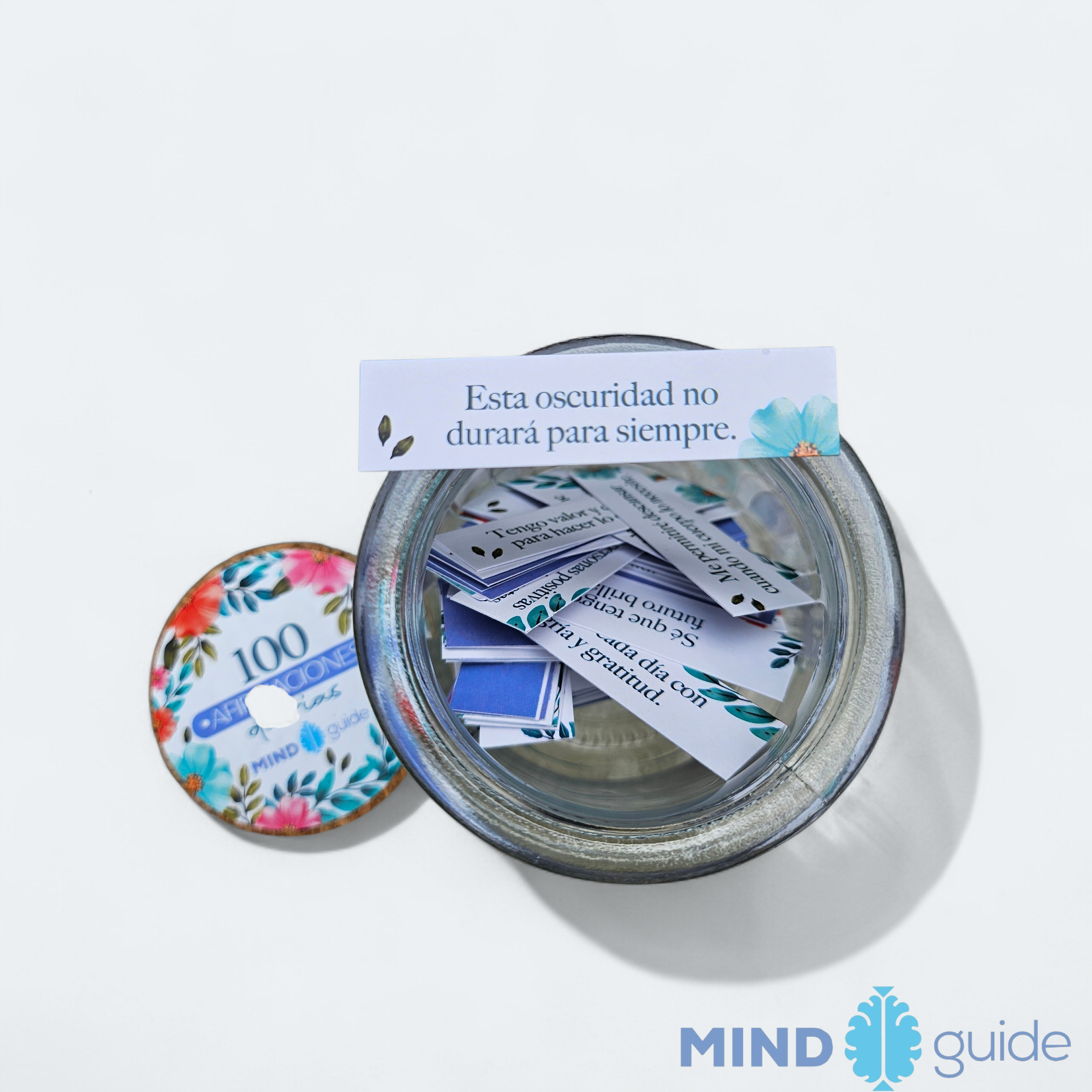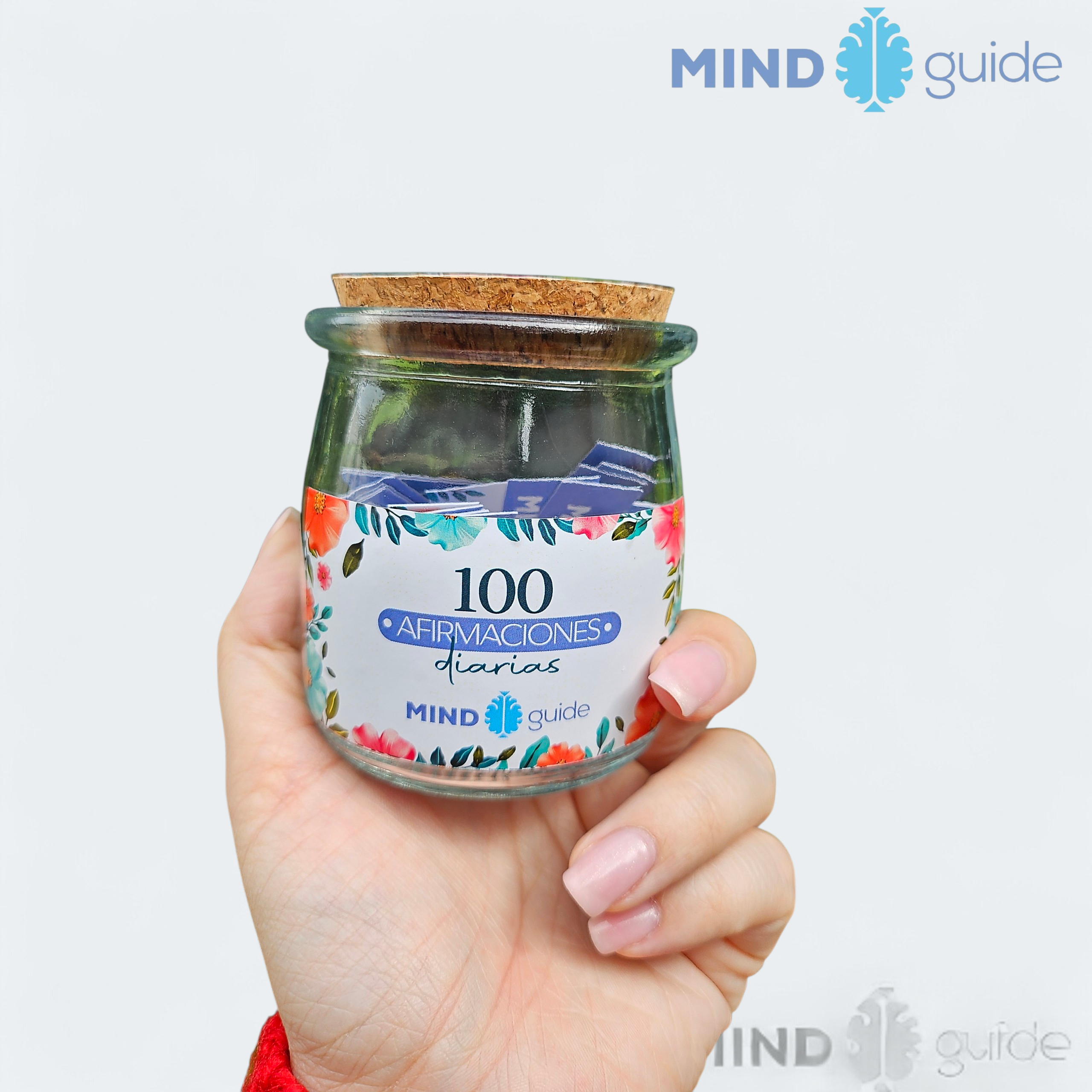 Frasco con 100 tarjetas de afirmaciones para beneficiar el desarrollo personal y la autoestima.